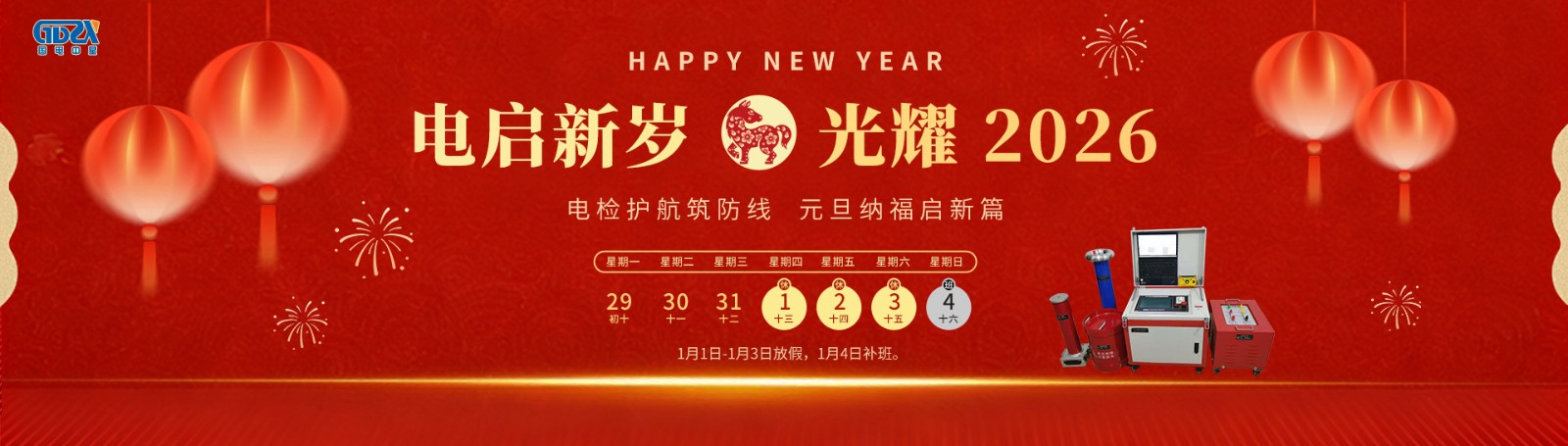 元旦鐘聲送吉祥,喜迎新年新氣象!根據(jù)國(guó)家節(jié)假日安排,結(jié)合公司實(shí)際情況,2026年元旦節(jié)放假安排如下:放假時(shí)間:2026年1月1日-1月3日放假,共3天。1月4日(星期日)正常上班。如有業(yè)務(wù)事宜請(qǐng)與相關(guān)業(yè)務(wù)人員聯(lián)系,相關(guān)聯(lián)系方式如下:1、產(chǎn)品和服務(wù)咨詢熱線:400-0828-027 / 132941535862、電氣試驗(yàn)技術(shù)咨詢熱線:186071457333、售后服務(wù)專線:027-65526006萬(wàn)象更新迎元旦,愿您新年新起點(diǎn),事業(yè)順?biāo)欤T事皆圓!——【武漢國(guó)電中星...